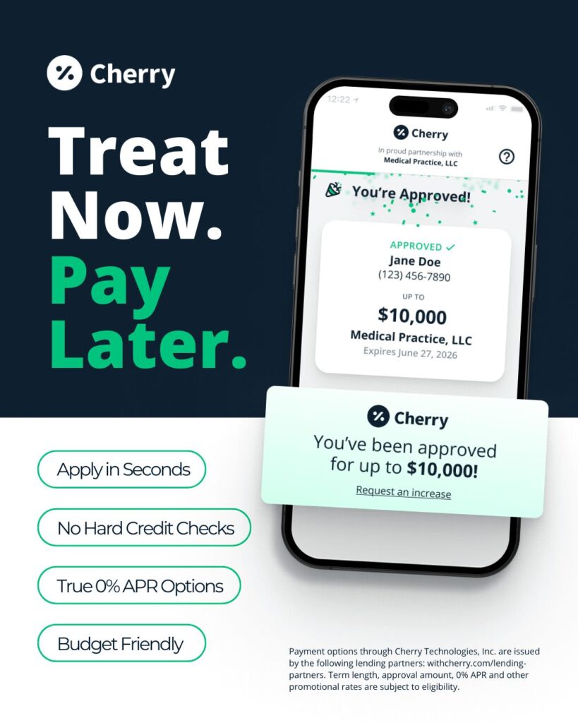 At Dallas Cosmetic Center, we’re proud to offer Cherry as a simple and convenient way to pay for your treatments. With flexible monthly payment plans, you can apply in seconds without affecting your credit score. Cherry also provides 0% APR options for qualifying patients, allowing you to choose a plan that fits comfortably within your budget. Get the care you want now and pay over time—making your cosmetic treatments more accessible and stress-free.
